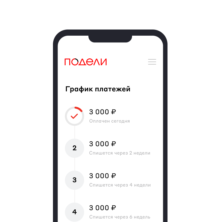 В приложении Подели есть график платежей, простой и понятный, с датами. А платежи мы сами спишем с вашей привязанной карты. Удобно. Только не забывайте ее пополнять к нужной дате, чтобы не заплатить штраф.